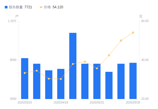 近一年(2024年9月30日至2025年9月30日),亿田智能A股股东户数从8317户,减低至7721户,降幅7.17%,区间股价上涨237.22%。