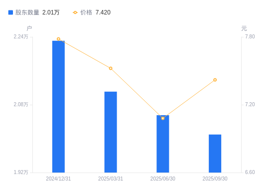 近一年(2024年9月30日至2025年9月30日),金花股份A股股东户数从2.26万户,减低至2.01万户,降幅11.24%,区间股价上涨19.64%。