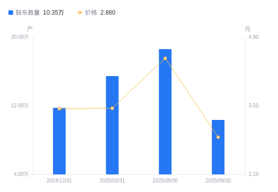 近一年(2024年9月30日至2025年9月30日),ST云动A股股东户数从9.04万户,增加至10.35万户,增幅14.48%,区间股价上涨26.55%。
