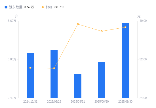 近一年(2024年9月30日至2025年9月30日),火炬电子A股股东户数从3.48万户,增加至3.57万户,增幅2.63%,区间股价上涨70.30%。