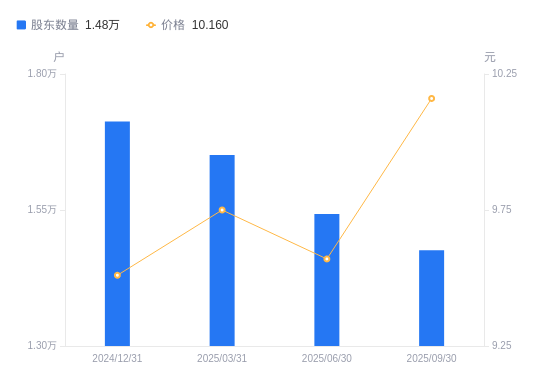 近一年(2024年9月30日至2025年9月30日),哈铁科技A股股东户数从1.92万户,减低至1.48万户,降幅23.12%,区间股价上涨17.32%。
