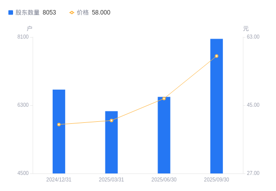 近一年(2024年9月30日至2025年9月30日),上海谊众A股股东户数从6031户,增加至8053户,增幅33.53%,区间股价上涨92.82%。