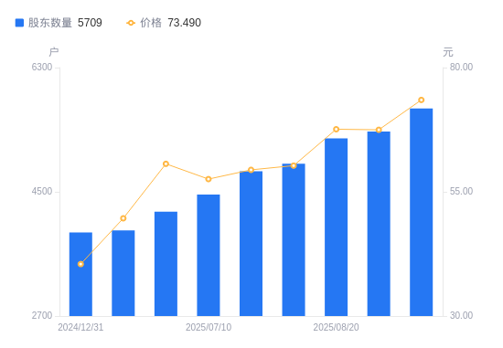 近一年(2024年9月30日至2025年9月30日),国力电子A股股东户数从3883户,增加至5709户,增幅47.03%,区间股价上涨129.73%。