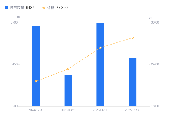 10月29日消息,数据显示,截至2025年9月30日,光格科技A股股东总户数为6487户,较上期(2025年6月30日)减少211户,降幅3.15%。公司最新A股总股本为6600万股,其中流通A股4893.07万股,户均持有流通A股数量为7542.88股,较上期增加350.1股,增幅4.87%;户均持流通A股市值21.01万元,较上期增加2万元,增幅10.54%。