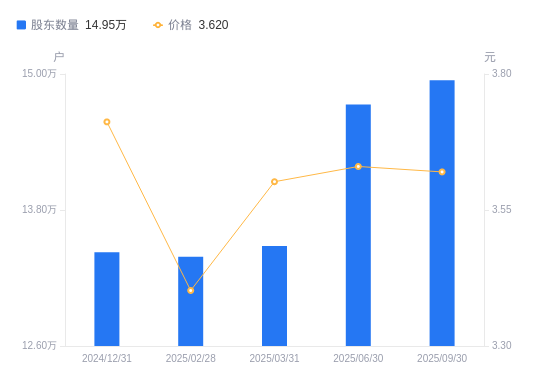 近一年(2024年9月30日至2025年9月30日),宁波港A股股东户数从13.4万户,增加至14.95万户,增幅11.50%,区间股价上涨5.48%。