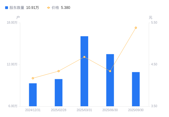 近一年(2024年9月30日至2025年9月30日),中信重工A股股东户数从9.25万户,增加至10.91万户,增幅17.89%,区间股价上涨42.29%。