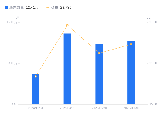 近一年(2024年9月30日至2025年9月30日),航锦科技A股股东户数从4.22万户,增加至12.41万户,增幅193.96%,区间股价上涨33.15%。