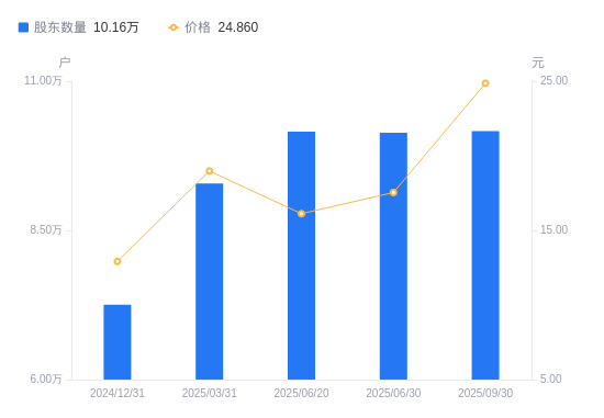 近一年(2024年9月30日至2025年9月30日),中鼎股份A股股东户数从5.85万户,增加至10.16万户,增幅73.89%,区间股价上涨96.21%。