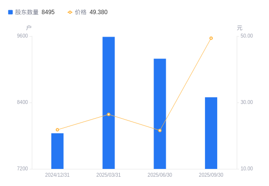 近一年(2024年9月30日至2025年9月30日),沃尔德A股股东户数从8115户,增加至8495户,增幅4.68%,区间股价上涨218.13%。