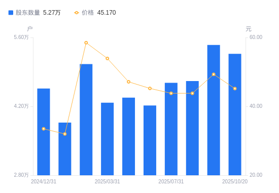 近一年(2024年9月30日至2025年9月30日),润建股份A股股东户数从3.83万户,增加至5.45万户,增幅42.36%,区间股价上涨68.29%。