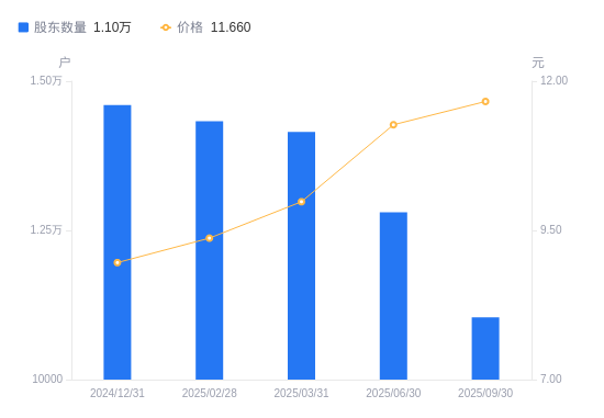 近一年(2024年9月30日至2025年9月30日),金富科技A股股东户数从1.62万户,减低至1.1万户,降幅31.87%,区间股价上涨47.78%。