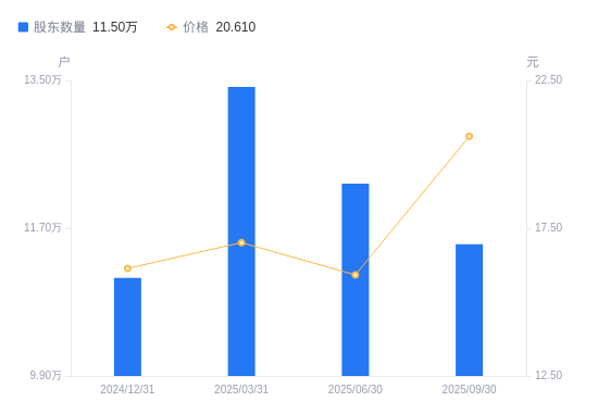近一年(2024年9月30日至2025年9月30日),南都电源A股股东户数从10.45万户,增加至11.5万户,增幅10.08%,区间股价上涨52.89%。