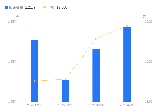 10月29日消息,数据显示,截至2025年9月30日,金麒麟A股股东总户数为2.21万户,较上期(2025年6月30日)增加1636户,增幅7.99%。公司最新A股总股本为1.96亿股,其中流通A股1.96亿股,户均持有流通A股数量为8863.55股,较上期减少707.94股,降幅7.40%;户均持流通A股市值17.37万元,较上期减少1624.15元,降幅0.93%。