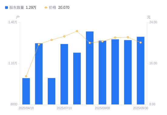 10月29日消息,数据显示,截至2025年9月30日,百龙创园A股股东总户数为1.29万户,较上期(2025年8月29日)增加238户,增幅1.87%。公司最新A股总股本为4.2亿股,其中流通A股4.2亿股,户均持有流通A股数量为3.24万股,较上期减少607.8股,降幅1.84%;户均持流通A股市值65.12万元,较上期减少4.59万元,降幅6.59%。