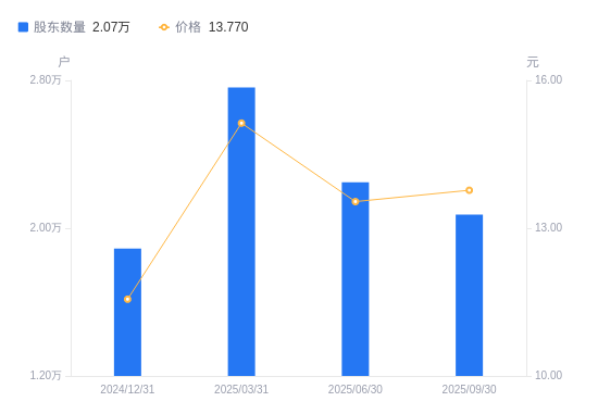 10月29日消息,数据显示,截至2025年9月30日,思进智能A股股东总户数为2.07万户,较上期(2025年6月30日)减少1751户,降幅7.79%。公司最新A股总股本为2.84亿股,其中流通A股2.26亿股,户均持有流通A股数量为1.09万股,较上期增加850.23股,增幅8.44%;户均持流通A股市值15.04万元,较上期增加1.4万元,增幅10.29%。