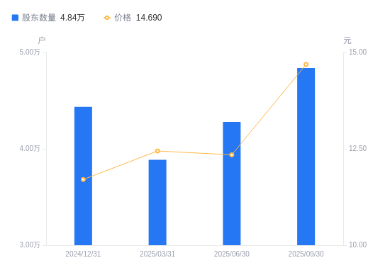 10月29日消息,数据显示,截至2025年9月30日,日月股份A股股东总户数为4.84万户,较上期(2025年6月30日)增加5604户,增幅13.10%。公司最新A股总股本为10.3亿股,其中流通A股10.28亿股,户均持有流通A股数量为2.12万股,较上期减少2782.59股,降幅11.58%;户均持流通A股市值31.21万元,较上期增加1.55万元,增幅5.22%。