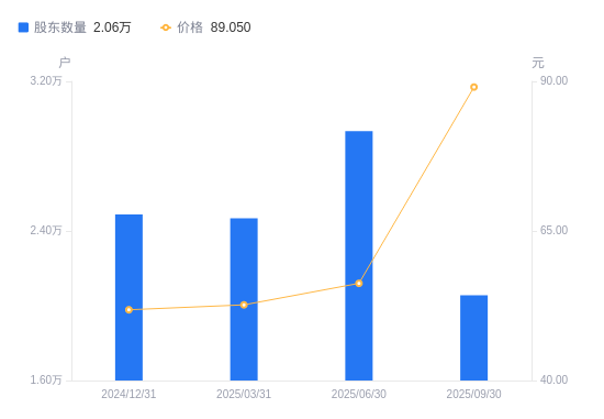 近一年(2024年9月30日至2025年9月30日),广立微A股股东户数从2.09万户,减低至2.06万户,降幅1.58%,区间股价上涨115.91%。
