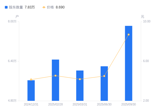 近一年(2024年9月30日至2025年9月30日),飞乐音响A股股东户数从5.26万户,增加至7.83万户,增幅48.83%,区间股价上涨169.88%。