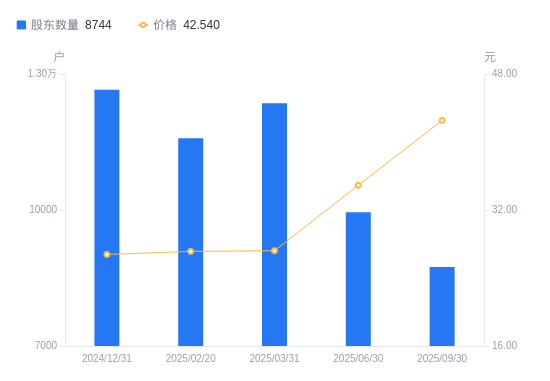 近一年(2024年9月30日至2025年9月30日),通灵股份A股股东户数从1.43万户,减低至8744户,降幅39.03%,区间股价上涨55.28%。