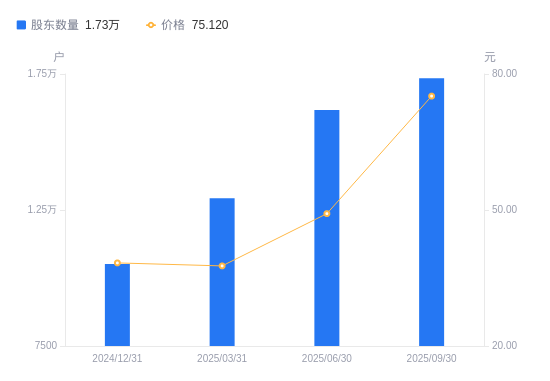 近一年(2024年9月30日至2025年9月30日),瑞可达A股股东户数从8228户,增加至1.73万户,增幅110.78%,区间股价上涨312.34%。