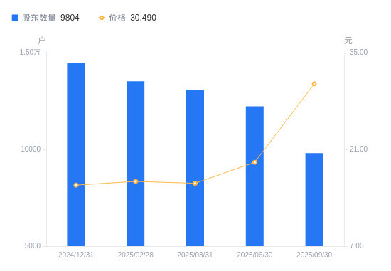 10月29日消息,数据显示,截至2025年9月30日,世茂能源A股股东总户数为9804户,较上期(2025年6月30日)减少2424户,降幅19.82%。公司最新A股总股本为1.6亿股,其中流通A股1.6亿股,户均持有流通A股数量为1.63万股,较上期增加3235.15股,增幅24.72%;户均持流通A股市值49.76万元,较上期增加24.73万元,增幅98.79%。