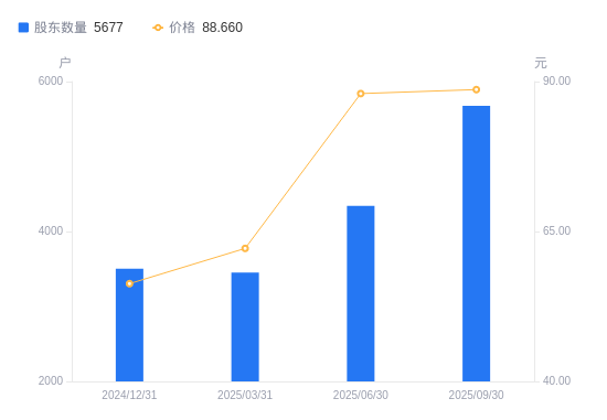 近一年(2024年9月30日至2025年9月30日),晶品特装A股股东户数从2860户,增加至5677户,增幅98.50%,区间股价上涨134.67%。