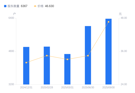 近一年(2024年9月30日至2025年9月30日),必易微A股股东户数从4579户,增加至6367户,增幅39.05%,区间股价上涨82.93%。