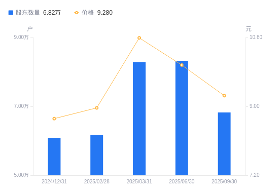 近一年(2024年9月30日至2025年9月30日),明星电力A股股东户数从6.94万户,减低至6.82万户,降幅1.74%,区间股价上涨18.07%。