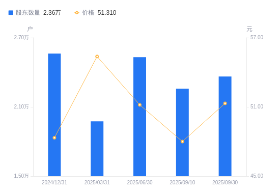 近一年(2024年9月30日至2025年9月30日),航天电器A股股东户数从1.89万户,增加至2.36万户,增幅24.90%,区间股价上涨1.38%。