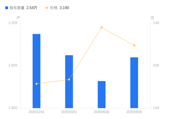 近一年(2024年9月30日至2025年9月30日),合兴包装A股股东户数从2.66万户,减低至2.54万户,降幅4.64%,区间股价上涨25.64%。