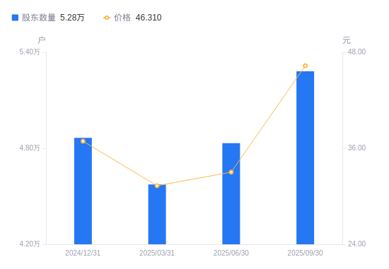近一年(2024年9月30日至2025年9月30日),德方纳米A股股东户数从5.15万户,增加至5.28万户,增幅2.50%,区间股价上涨39.45%。