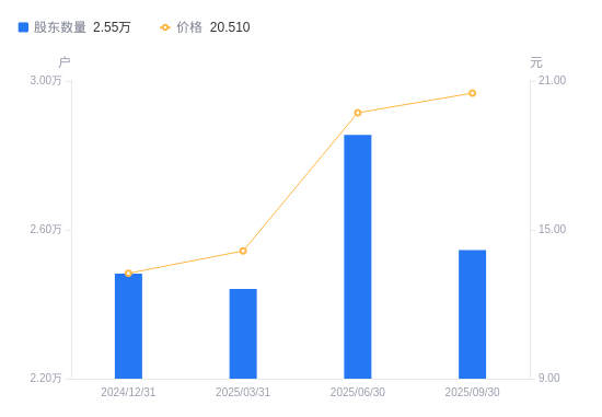 近一年(2024年9月30日至2025年9月30日),格力博A股股东户数从2.8万户,减低至2.55万户,降幅9.23%,区间股价上涨56.09%。
