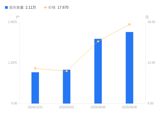 10月29日消息,数据显示,截至2025年9月30日,玉马科技A股股东总户数为2.11万户,较上期(2025年6月30日)增加2012户,增幅10.55%。公司最新A股总股本为3.08亿股,其中流通A股2.41亿股,户均持有流通A股数量为1.14万股,较上期减少1204.11股,降幅9.54%;户均持流通A股市值20.17万元,较上期增加1.04万元,增幅5.44%。