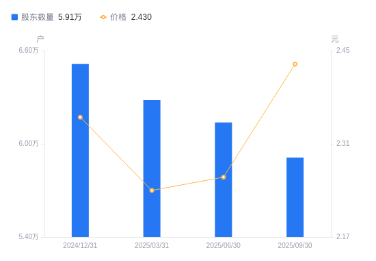 10月29日消息,数据显示,截至2025年9月30日,腾达建设A股股东总户数为5.91万户,较上期(2025年6月30日)减少2265户,降幅3.69%。公司最新A股总股本为15.94亿股,其中流通A股15.87亿股,户均持有流通A股数量为2.69万股,较上期增加990.87股,增幅3.83%;户均持流通A股市值6.53万元,较上期增加6804.27元,增幅11.64%。