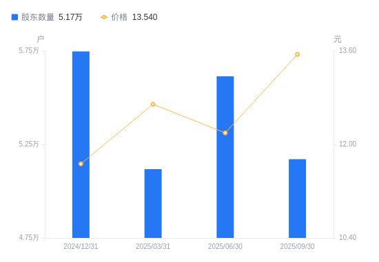 近一年(2024年9月30日至2025年9月30日),广东鸿图A股股东户数从5.81万户,减低至5.17万户,降幅11.01%,区间股价上涨19.12%。