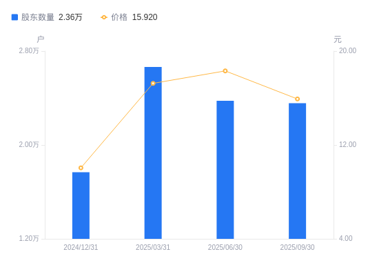 10月29日消息,数据显示,截至2025年9月30日,深水海纳A股股东总户数为2.36万户,较上期(2025年6月30日)减少209户,降幅0.88%。公司最新A股总股本为1.77亿股,其中流通A股1.53亿股,户均持有流通A股数量为6475.48股,较上期增加56.94股,增幅0.89%;户均持流通A股市值10.31万元,较上期减少1.44万元,降幅12.28%。
