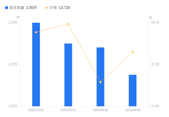 近一年(2024年9月30日至2025年9月30日),龙版传媒A股股东户数从2.7万户,减低至1.95万户,降幅27.61%,区间股价下跌1.08%。