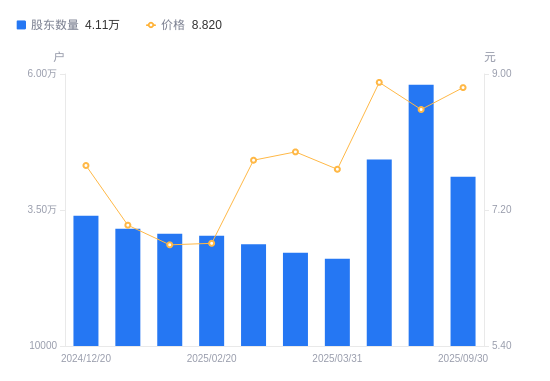 近一年(2024年9月30日至2025年9月30日),探路者A股股东户数从2.68万户,增加至4.11万户,增幅53.43%,区间股价上涨58.09%。