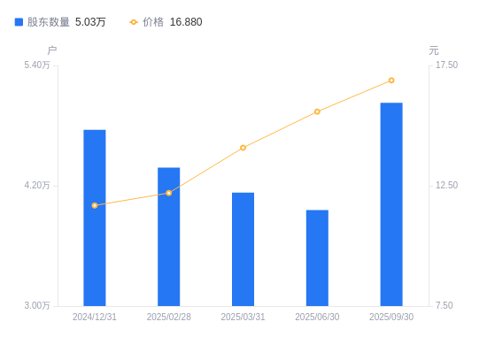 近一年(2024年9月30日至2025年9月30日),恒润股份A股股东户数从4.33万户,增加至5.03万户,增幅16.10%,区间股价上涨55.15%。