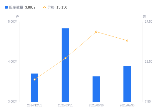 近一年(2024年9月30日至2025年9月30日),麦迪科技A股股东户数从2.99万户,增加至3.89万户,增幅30.27%,区间股价上涨56.83%。