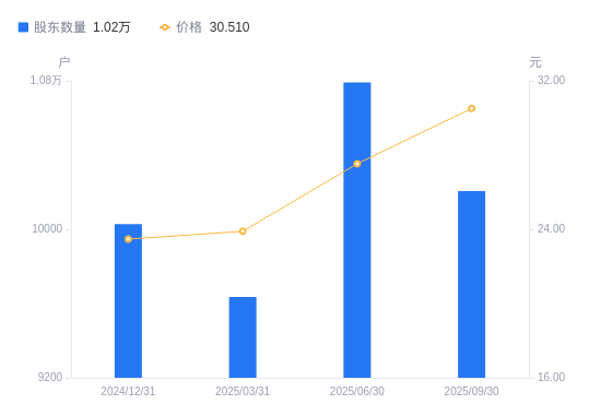 近一年(2024年9月30日至2025年9月30日),惠柏新材A股股东户数从1.09万户,减低至1.02万户,降幅6.23%,区间股价上涨20.45%。