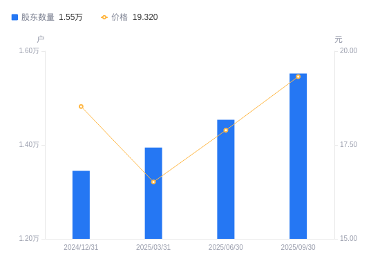近一年(2024年9月30日至2025年9月30日),苏文电能A股股东户数从1.63万户,减低至1.55万户,降幅4.69%,区间股价上涨12.69%。