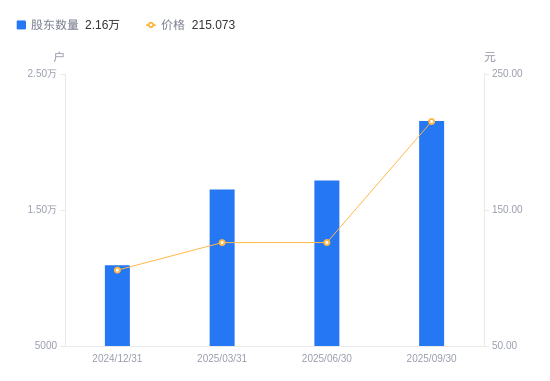 近一年(2024年9月30日至2025年9月30日),欧陆通A股股东户数从1.08万户,增加至2.16万户,增幅98.79%,区间股价上涨420.42%。