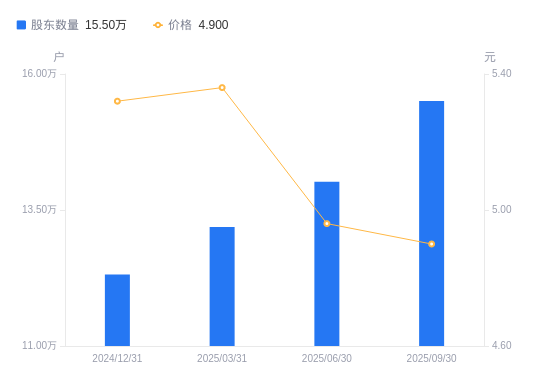 近一年(2024年9月30日至2025年9月30日),浙能电力A股股东户数从11.69万户,增加至15.5万户,增幅32.57%,区间股价下跌18.33%。