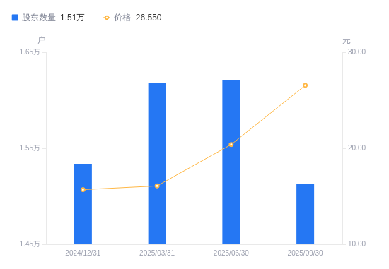 10月29日消息,数据显示,截至2025年9月30日,联赢激光A股股东总户数为1.51万户,较上期(2025年6月30日)减少1083户,降幅6.68%。公司最新A股总股本为3.41亿股,其中流通A股3.41亿股,户均持有流通A股数量为2.26万股,较上期增加1506.93股,增幅7.16%;户均持流通A股市值59.9万元,较上期增加16.97万元,增幅39.53%。