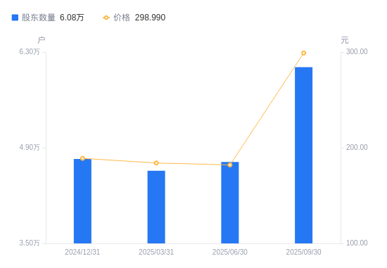 近一年(2024年9月30日至2025年9月30日),中微公司A股股东户数从3.72万户,增加至6.08万户,增幅63.26%,区间股价上涨118.88%。