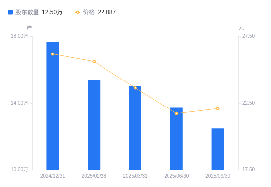 近一年(2024年9月30日至2025年9月30日),中信海直A股股东户数从13.07万户,减低至12.5万户,降幅4.36%,区间股价上涨29.22%。