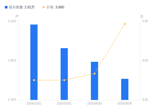 近一年(2024年9月30日至2025年9月30日),新天科技A股股东户数从3.03万户,减低至2.81万户,降幅7.45%,区间股价上涨40.48%。