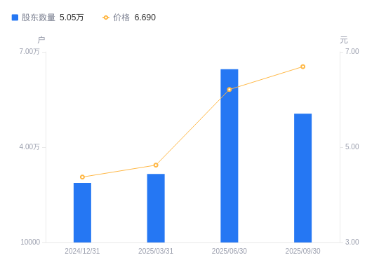 10月29日消息,数据显示,截至2025年9月30日,金河生物A股股东总户数为5.05万户,较上期(2025年6月30日)减少1.4万户,降幅21.69%。公司最新A股总股本为7.72亿股,其中流通A股7.47亿股,户均持有流通A股数量为1.48万股,较上期增加3245.91股,增幅28.11%;户均持流通A股市值9.9万元,较上期增加2.73万元,增幅38.01%。