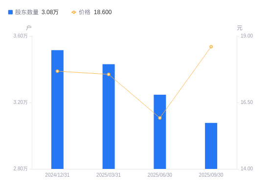 近一年(2024年9月30日至2025年9月30日),永贵电器A股股东户数从3.38万户,减低至3.08万户,降幅9.03%,区间股价上涨20.86%。